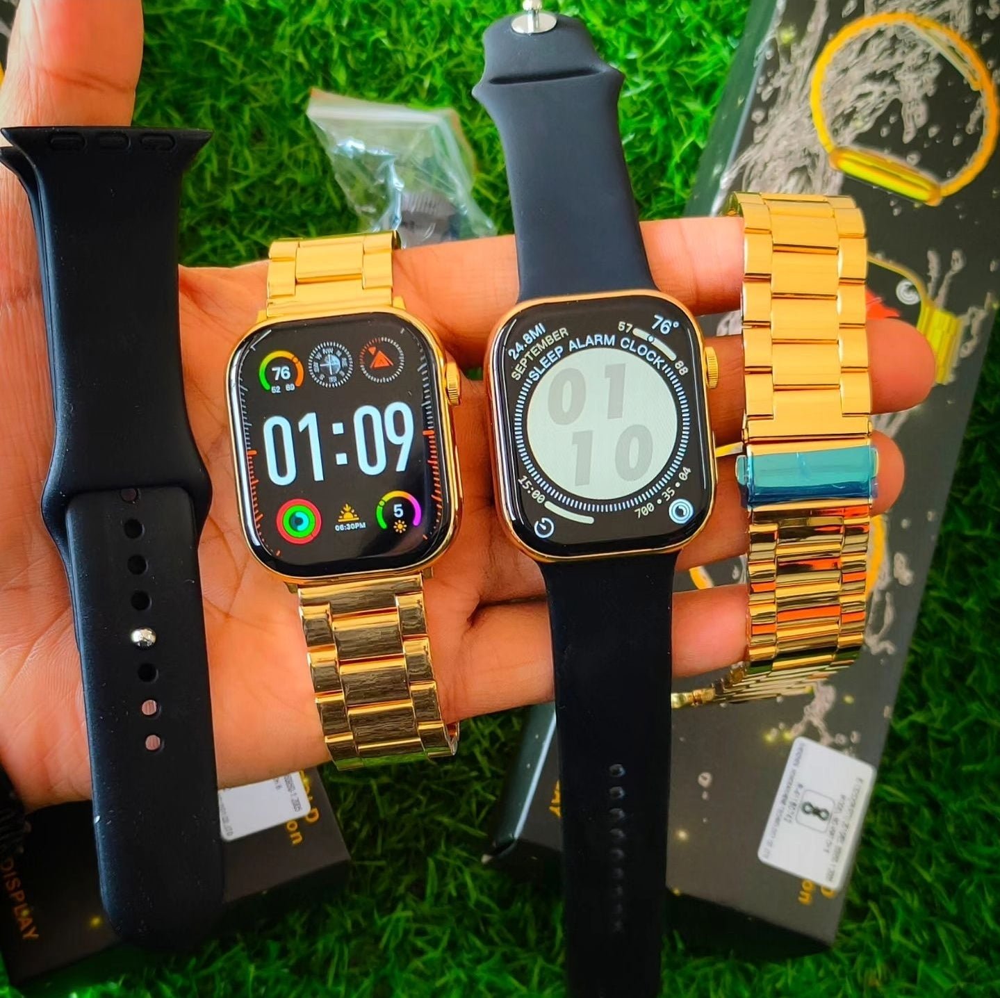 Wir präsentieren die Series 9 Gold Edition Smartwatch mit zwei Armbändern – eine herausragende Neuauflage der Apple Watch Series 9, die Stil und Funktionalität perfekt vereint. Diese atemberaubende goldene Smartwatch bietet fortschrittliche Smart-Funktionen zu einem unschlagbaren Preis und lässt Sie Ihren Stil am Handgelenk unterstreichen. Das Design mit zwei Armbändern sorgt für angenehmen Tragekomfort und mühelosen Stil für jeden Anlass.